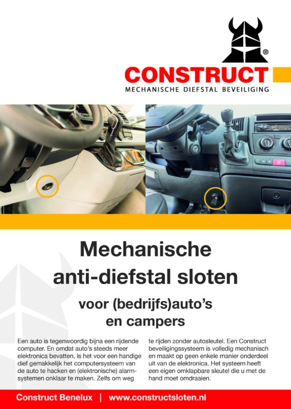 Construct Benelux BV is een bedrijf dat sinds 2011 sloten levert voor voertuigen, zoals (bedrijfs)auto’s, campers en overheaddeuren. Ze zijn gespecialiseerd in het maken van veilige en betrouwbare anti-diefstalsystemen. Hun bekendste producten zijn het versnellingspook-slot en het stuuras-slot, die zorgen voor een betere bescherming van je voertuig tegen diefstal. Deze sloten worden op slimme plekken in het voertuig ingebouwd, waardoor ze uit het zicht blijven en extra moeilijk te verwijderen zijn.